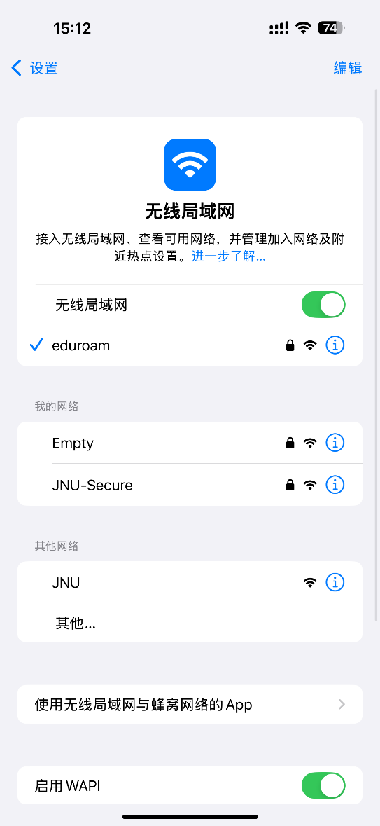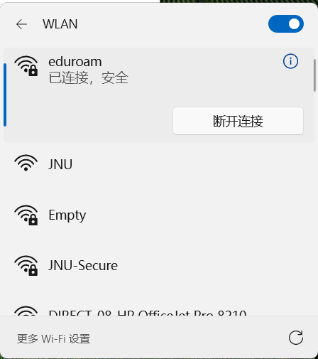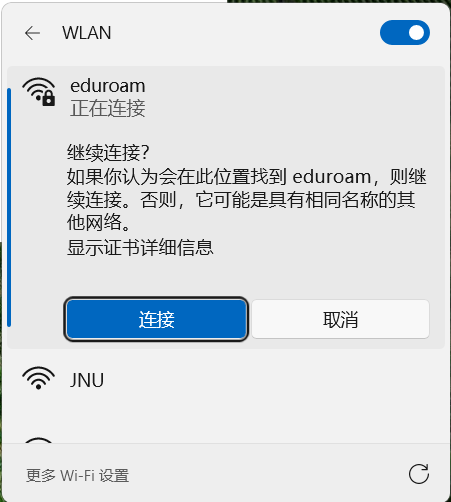 目前,我校成功部署了eduroam服务。我校师生可以在国内外其他加入了eduroam联盟的大学和科研机构,直接免费使用我校的校园网账号(学工号@jnu.edu.cn)和密码接入当地无线网络。同时,我校的网络也开放给该联盟的其他大学和科研机构的成员,来我校交流访问的师生凭其所属机构的账号及密码,也可以免费登录使用网络。